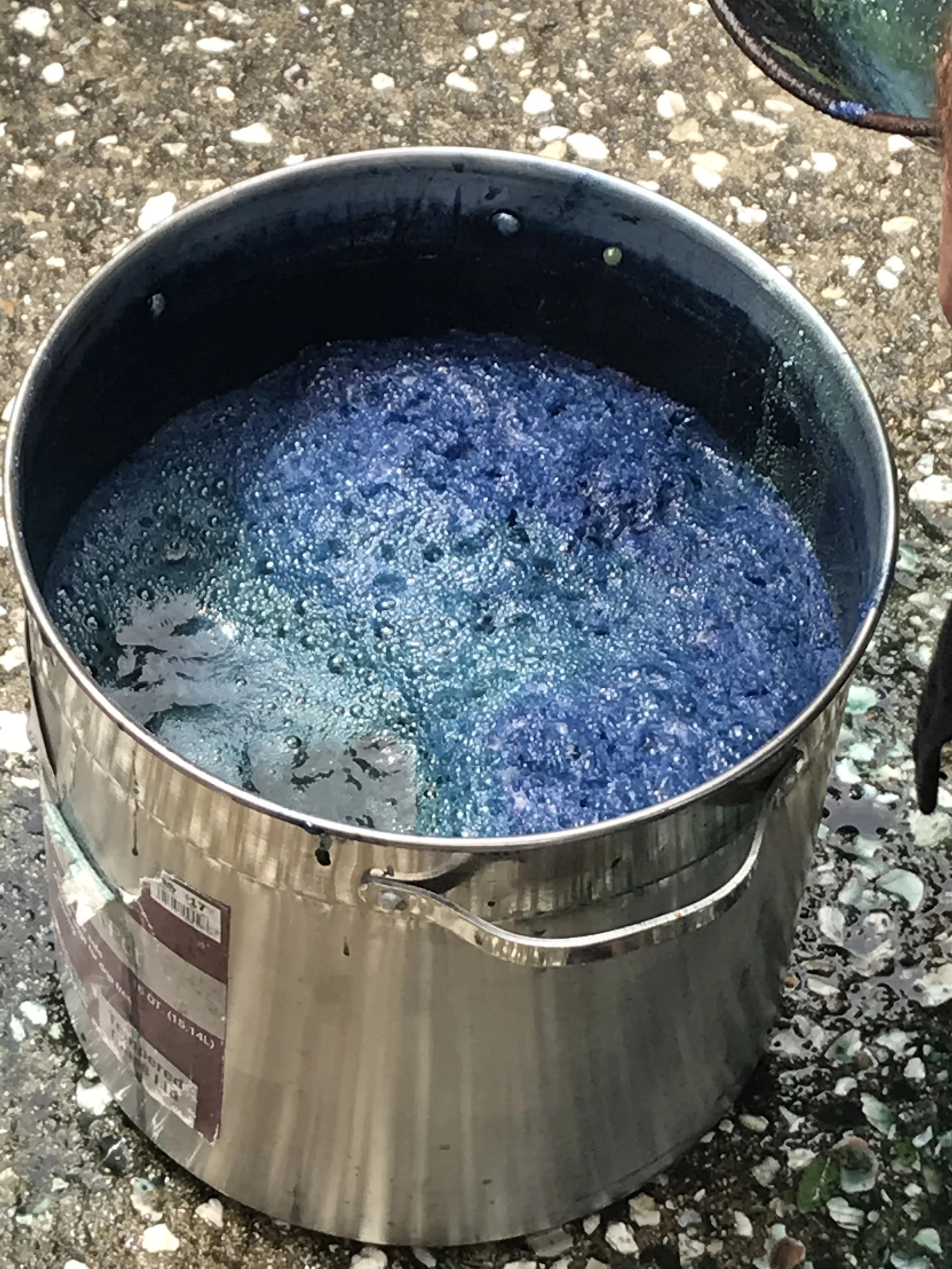 Once you’ve collected the water from the jars, you will add two chemicals to the mix. The first is lime. Once you add this the water will start to turn bright blue-green. Pour the mixture back and forth between two buckets, creating a blue foamy froth on top. Continue to aerate for 15 or so minutes. Once aerated, add carbamide and avoid any further aeration. Stir gently and you’re ready to dye!